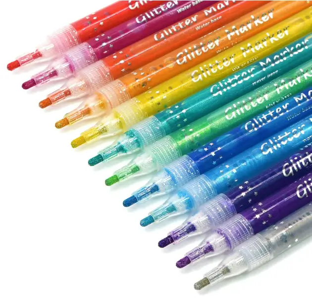 TWOHANDS Glitter Markers feature water-based, washable ink that adds a bright metallic shimmer to drawings, cards, and craft projects. The smooth ink flow and fine control make them easy to use for lettering, detailing, and decorative accents. With 12 vibrant colors, these markers are ideal for DIY crafts, posters, greeting cards, and gift designs without permanent mess